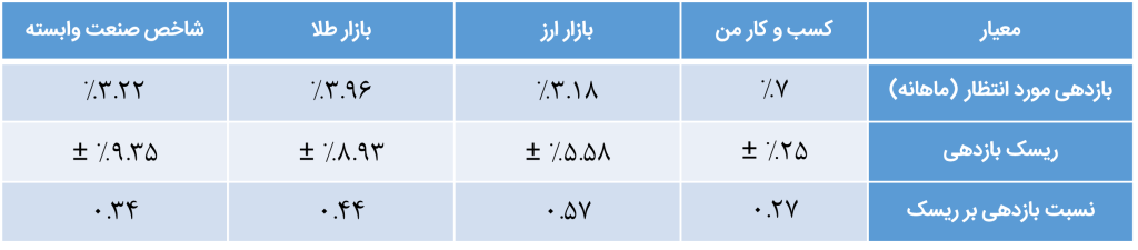 - کسب و کار شما بیشترین بازدهی ماهانه را در بین بازارهای مقایسه شده دارد، بدین صورت که انتظار می رود شما شاهد رشدی 7 درصدی در هر ماه باشید و اما با توجه به ریسک 25 درصدی آن، دامنه حرکتی آن (رشد 7% ماهانه) می تواند از 18- تا 32 درصد متغیر باشد.