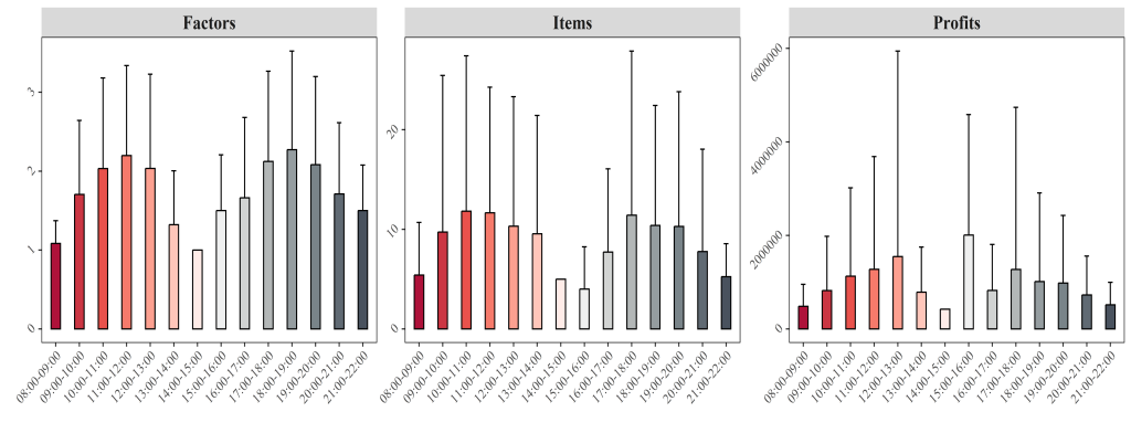 همانطور که مشاهده میشود، میزان فروش اقلام، مراجعه مشتریان و سود حاصله کاملا رفتار نوسانی داشته است. به این صورت که بعد از ساعات ابتدایی شاهد رشد هستیم به طوریکه در ساعات بین 11 الی 13 به بیشترین مقدار میرسیم و بعد از آن شاهد افت فروش هستیم تا اینکه مجددا از ساعت 15 تا 18 فروش به حالت بیشینه باز خواهد گشت.